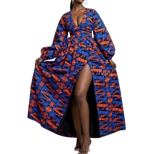 Robe longue en wax aux motifs vibrants, avec manches bouffantes et fente audacieuse. Confort et élégance se rencontrent pour une tenue à la fois traditionnelle et moderne.